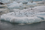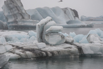 Brokstukken van de gletsjer in het gletsjermeer Jökulsárlón, druk bevolkt met vogels.