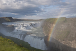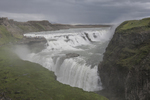 De Gullfoss (Gouden waterval). In de ochtend staat de zon aan de verkeerde kant voor de beroemde regenboog die hij vormt boven deze waterval...
